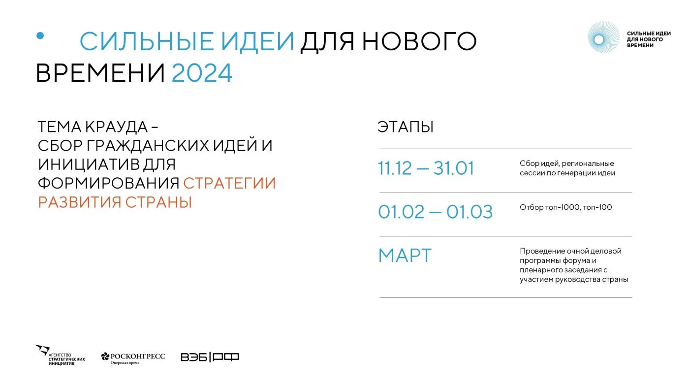 Это масштабное событие, организуемое с целью сформировать содружество инициативных людей и консолидировать 100 сильных идей, которые внесут значимый вклад в развитие страны и достижение национальных целей до 2030 года.